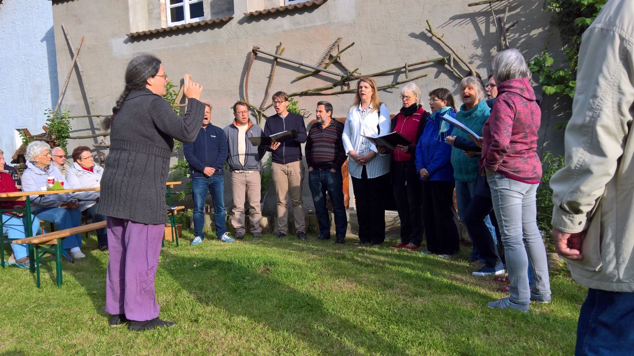 Auf Einladung des gemischten Chores St. Nikolaus Machtsum untermalten wir abwechselnd mit diesem den gemütlichen Frühschoppen im dortigen Gemeindezentrum. Bei strahlendem Wetter wurde der Auftritt spontan nach draußen verlegt, was für alle Sänger eine größere Herausforderung ist als drinnen zu singen. Trotzdem war der Klang der TonCoolen ganz angenehm und die Gulaschsuppe lecker und wir verbrachten einen schönen Frühsommermorgen mit Musik und Gesang.