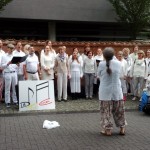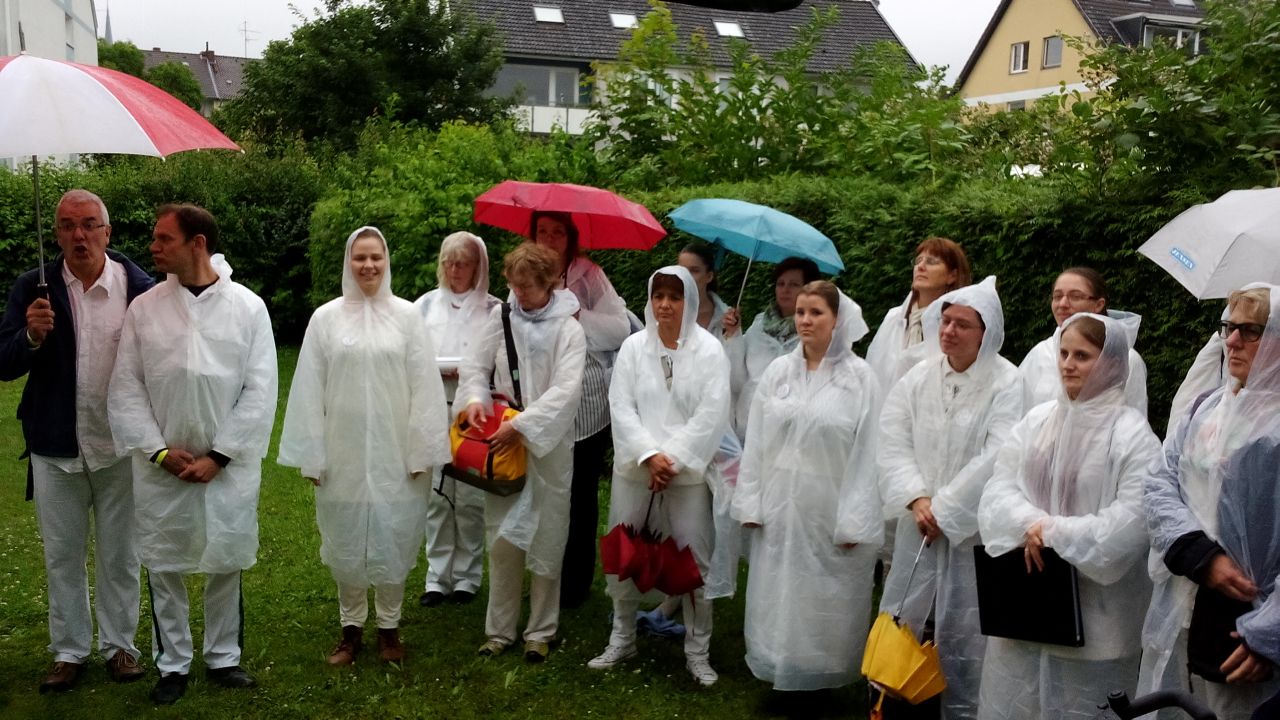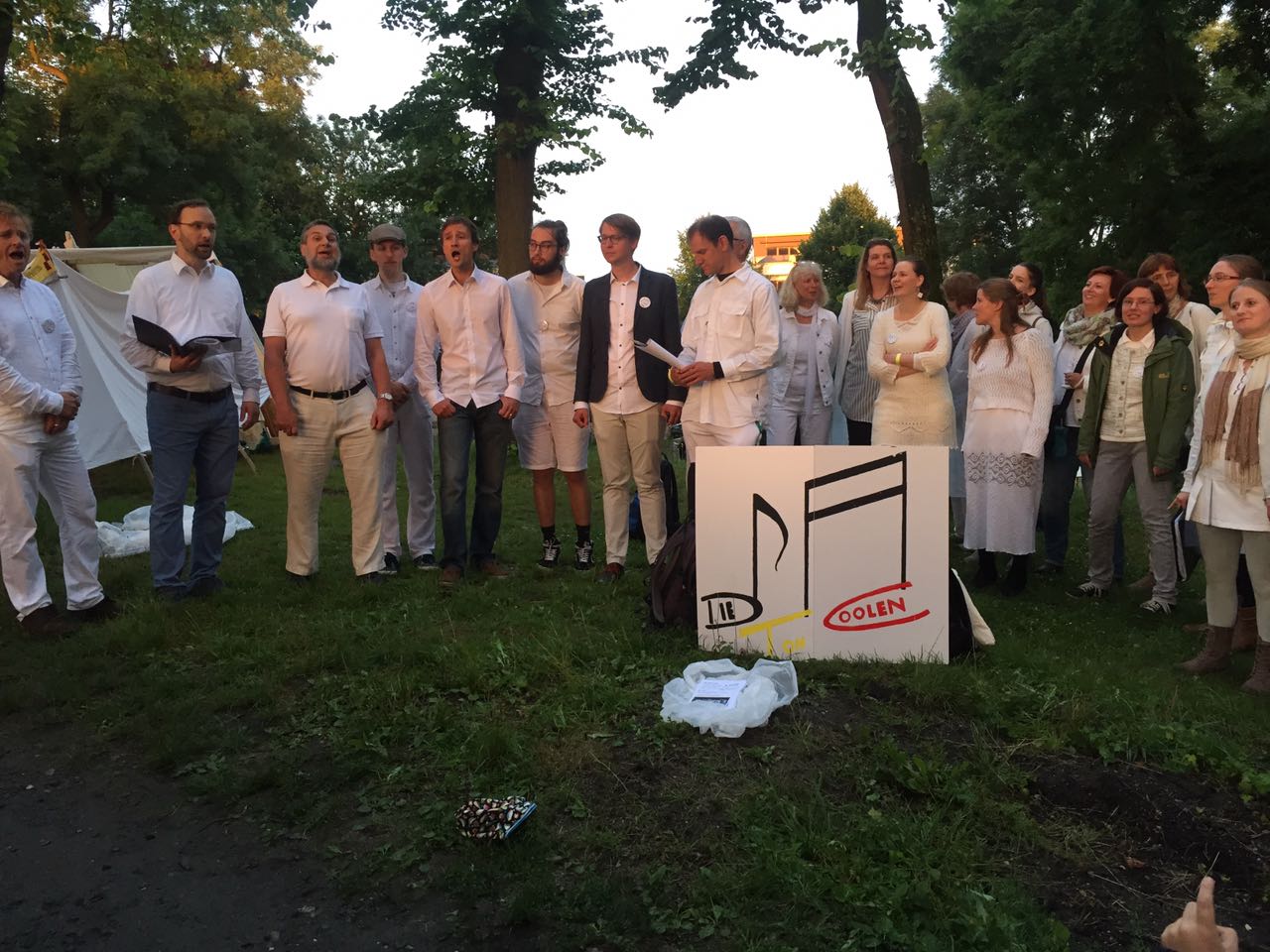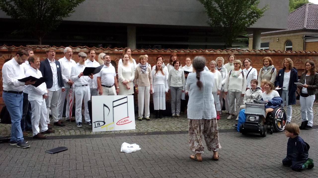 Für den Auftritt bei den Hildesheimer Wallungen 2017 hatten wir wirklich viel geprobt, vor allem draußen, um uns auf unterschiedlichste Wetterbedingungen vorzubereiten. Alle trugen weiß und nach Abzug der anfänglichen Regenschauer konnten die Capes ausgezogen werden. Egal wo wir als Walking Act sangen, gruppierte sich sofort eine große Menschentraube um uns herum und lauschte angeregt. Wir bekamen viel positive Resonanz und sangen über den Sonnenuntergang hinaus bis es dunkel wurde ...