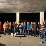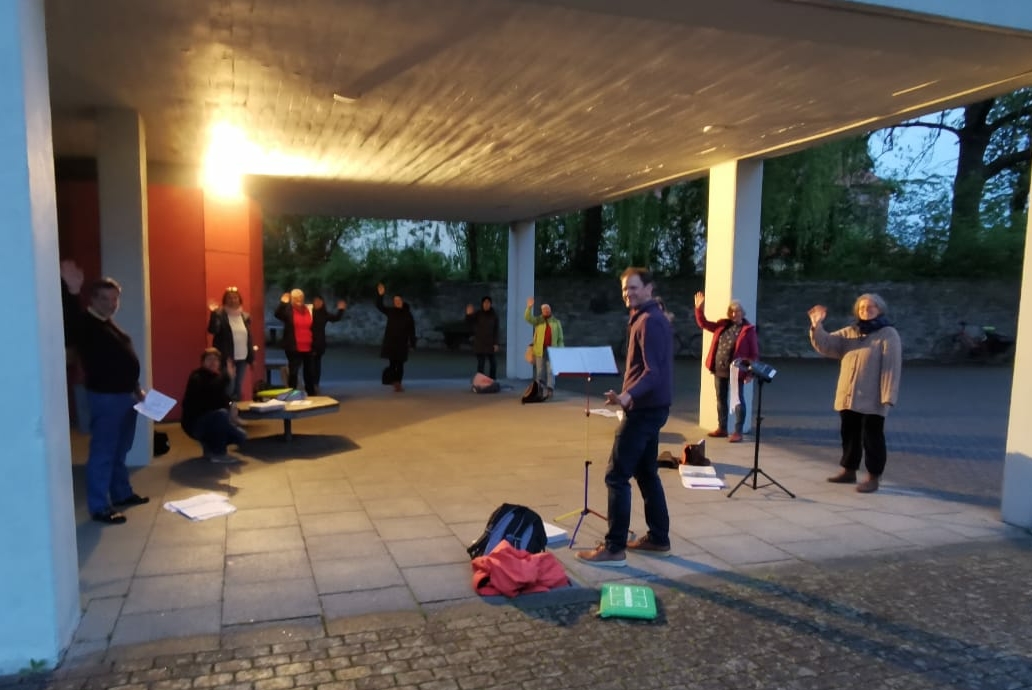 Online-Proben mit Zoom. Leider kann man auf diese Art nicht gemeinsam singen, da der Zeitverzug über das Internet einfach zu groß ist. Wir konnten also nur jeder für sich die eigene Stimme im eigenen Wohnzimmer erarbeiten. Immerhin sind wir so untereinander in Kontakt geblieben und die Stimmen sind nicht ganz eingerostet.Ab 10. 5. Life-Proben Open-Air