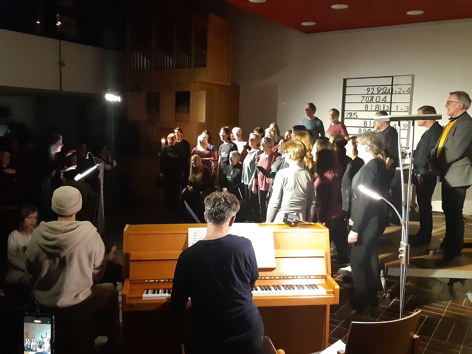 "Back to Life" heißt unser bunt gemischtes Programm, das wir anfänglich unter erschwerten Corona-Bedingungen und schließlich mit noch nicht wieder maximaler Besetzung erarbeitet haben. Wir präsentierten es in der voll besetzten Evangelisch-Reformierten Kirche in Hildesheim, Immengarten 22. Der Termin in der dunklen Jahreszeit machte es möglich, spezielle Lichteffekte einzusetzen, die einige der Stücke noch eindrucksvoller erscheinen ließen. Begleitet wurden wir von Klavier, Gitarre und Cahon. Insgesamt haben das Publikum und wir die Darbietung nach langer Unterbrechung sehr genossen.