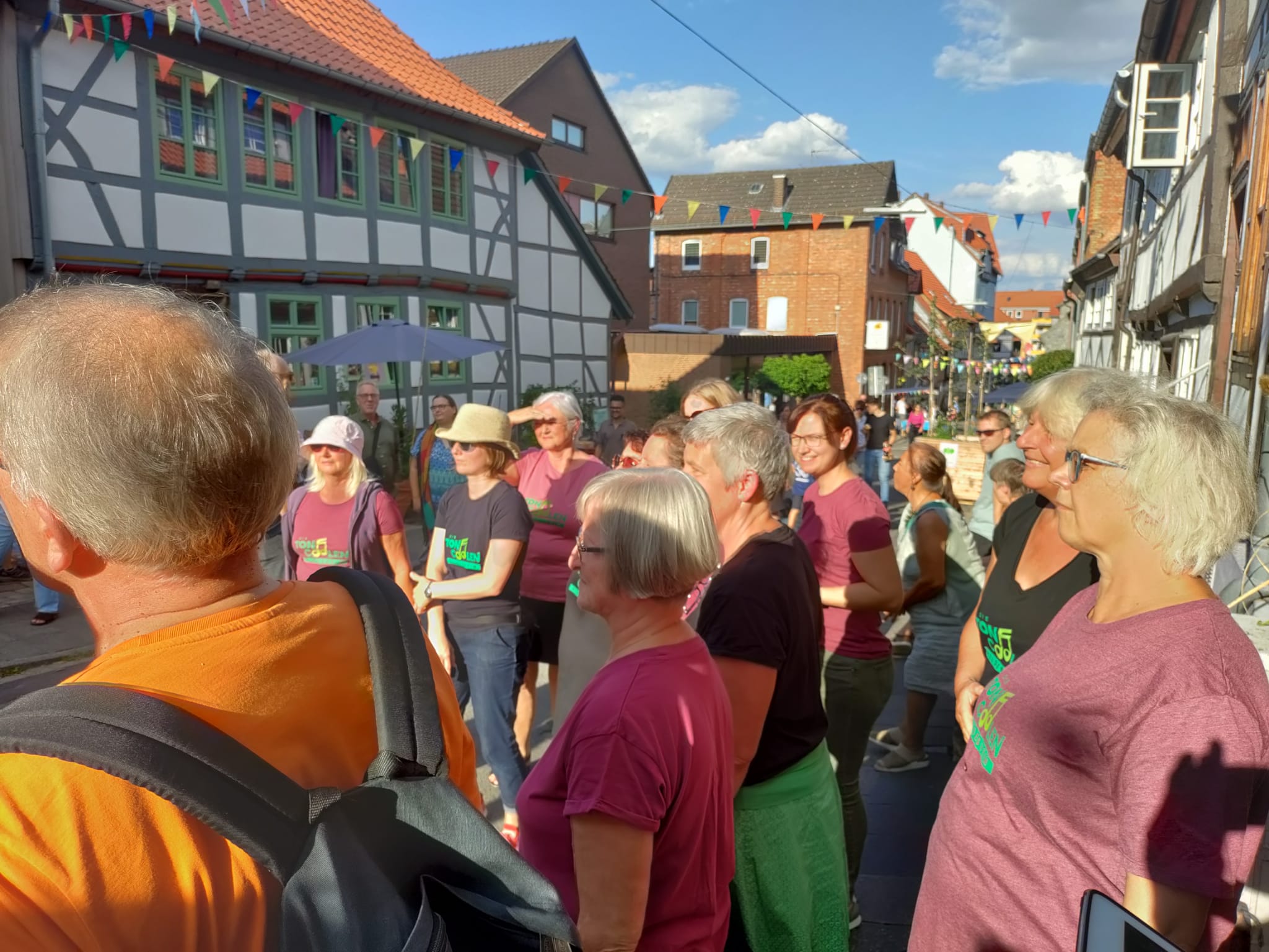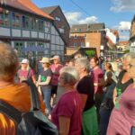 In wunderschöner Umgebung auf der Landesgartenschau 2023 in Bad Gandersheim hatten wir einen 20-minütigen Auftritt Der Chorverband Niedersachsen-Bremen hatte an diesem Wochenende zahlreiche Chöre eingeladen, auf den beiden Bühnen (Parkbühne und Seebühne) einen Querschnitt durch ihr jeweiliges Repertoire zu darzubieten. Unser Beitrag war am Samstag bis 16h auf der Seebühne. Für uns ungewohnt, sorgten Mikrophone und Lautsprecher dafür, dass wir auch in größerem Abstand im nördlichen Teil des schon fast herbstlichen Geländes noch gut zu hören waren. Unsere Stücke-Auswahl kam bei den Zuhörern gut an. Anschließend hatten wir noch Gelegenheit, das Gelände der Gartenschau auf eigene Faust zu erkunden.